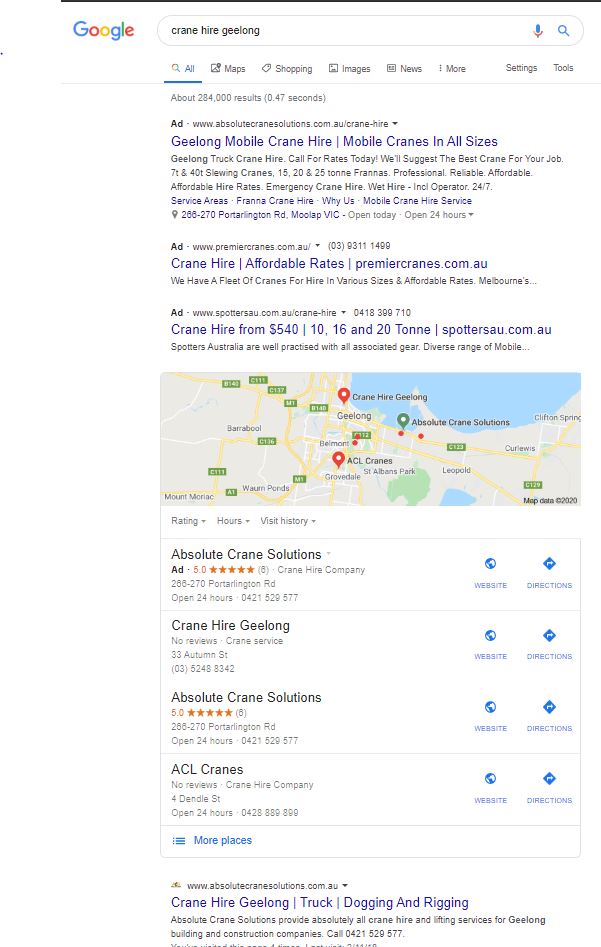 See below example of a client (Absolute Crane Solutions) who dominate Google search for what they do best “crane hire Geelong“.