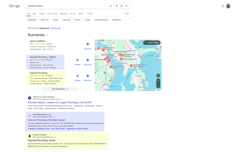 To test if your plumbing website is ranking on Google for plumbers in Hobart, simply go to Google and search for “plumbers Hobart.” If you aren’t in the Google Business Profile three pack or the top 4 organic listings, then you lose, and your website needs help.