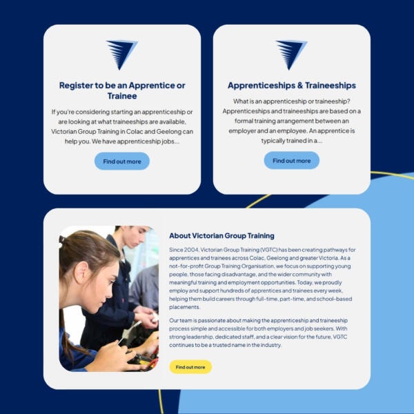Victoria Group Training matches trainees and apprentices with employers/workplaces/schools, and vice-versa. They build skills, create jobs, help people find jobs and help employers find skilled workers. They engaged GOOP Digital for a website redesign.